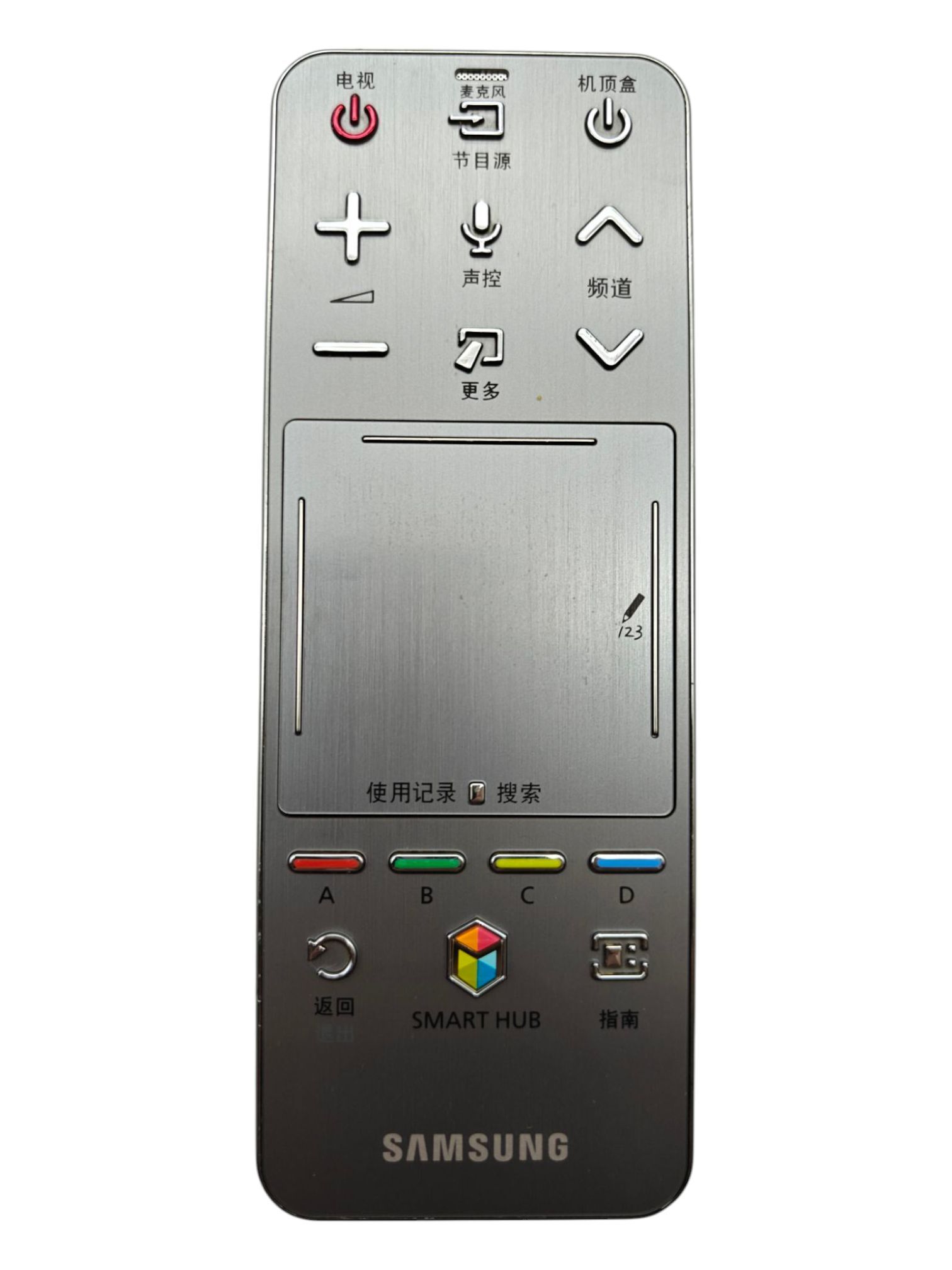 Есть на корпусе пульта и стандартные кнопки управления, позволяющие включить и выключить телевизор, переключить канал, отрегулировать громкость и отключить звук, изменить источник сигнала, включить приемник кабельного или спутникового телевидения, запустить Smart Hub, просмотреть программу передач, возвратиться к предыдущему меню, отобразить информацию и назначить цветные кнопки. Из «особенных» кнопочек стоит отметить: включение функции «Распознавание голоса» (голосовое управление) и отображение панели виртуального пульта.